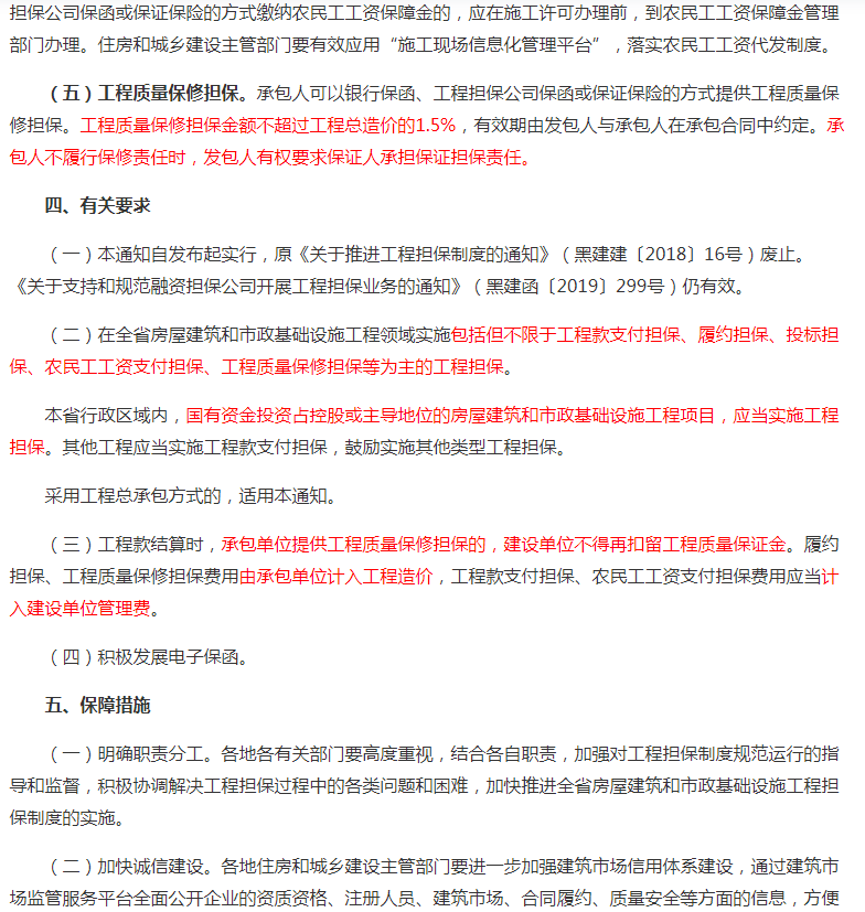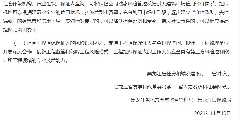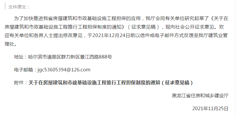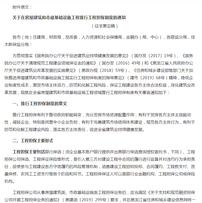 11月26日,黑龙江省住建厅发布《关于对<关于在房屋建筑和市政基础设施工程推行工程担保制度的通知>公开征求意见的公告》。明确:积极推行工程担保制度。