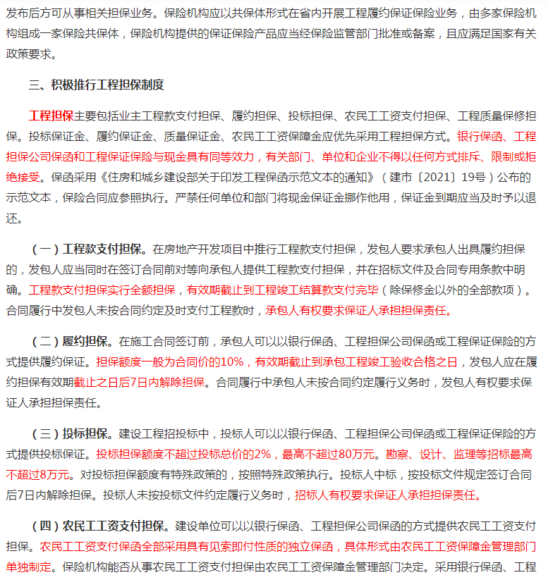1、在全省房屋建筑和市政基础设施工程领域实施包括但不限于工程款支付担保、履约担保、投标担保、农民工工资支付担保、工程质量保修担保等为主的工程担保。