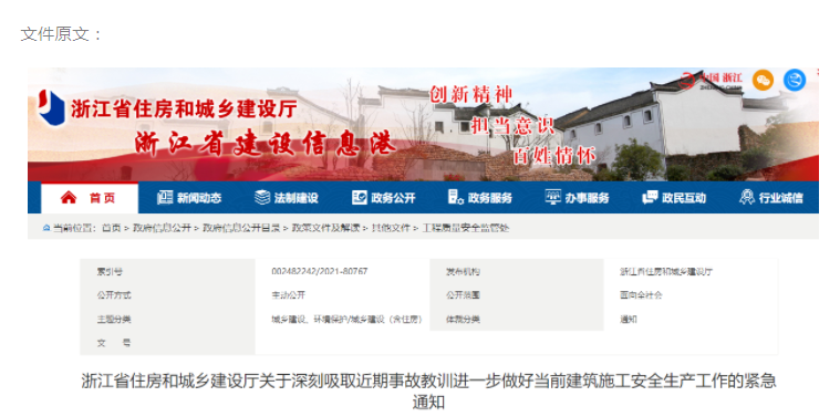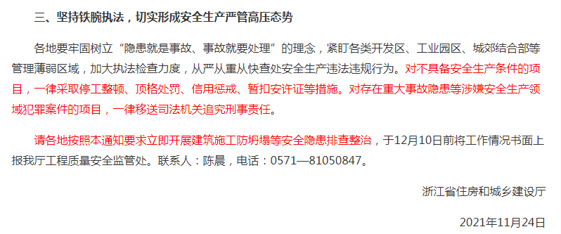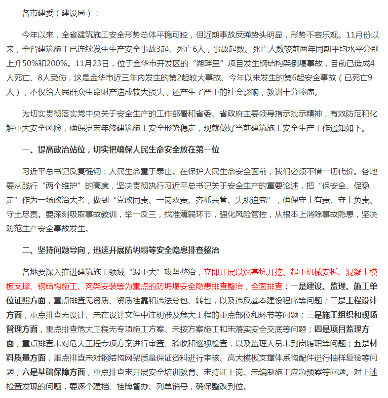 11月26日,省住建厅发布《浙江省住房和城乡建设厅关于深刻吸取近期事故教训进一步做好当前建筑施工安全生产工作的紧急通知》。通知明确: