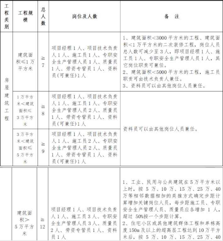 3.对于复杂的体育场所、综合性工程以及工期较紧、多班施工作业的工程,在以上配备标准基础上应适当增加施工员、质量员、专职安全生产管理人员人数。